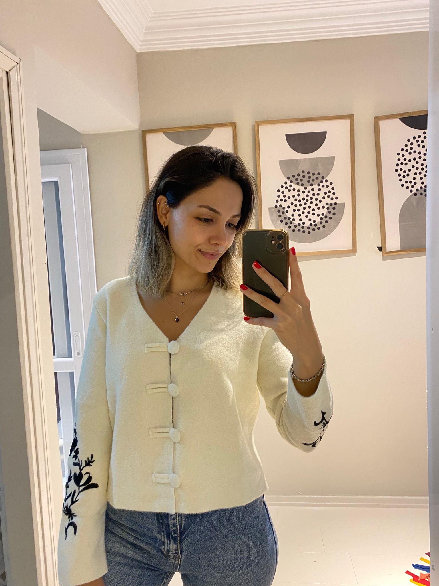 KOLLARI NAKIŞ İŞLEMELİ EKRU TRİKO CEKET